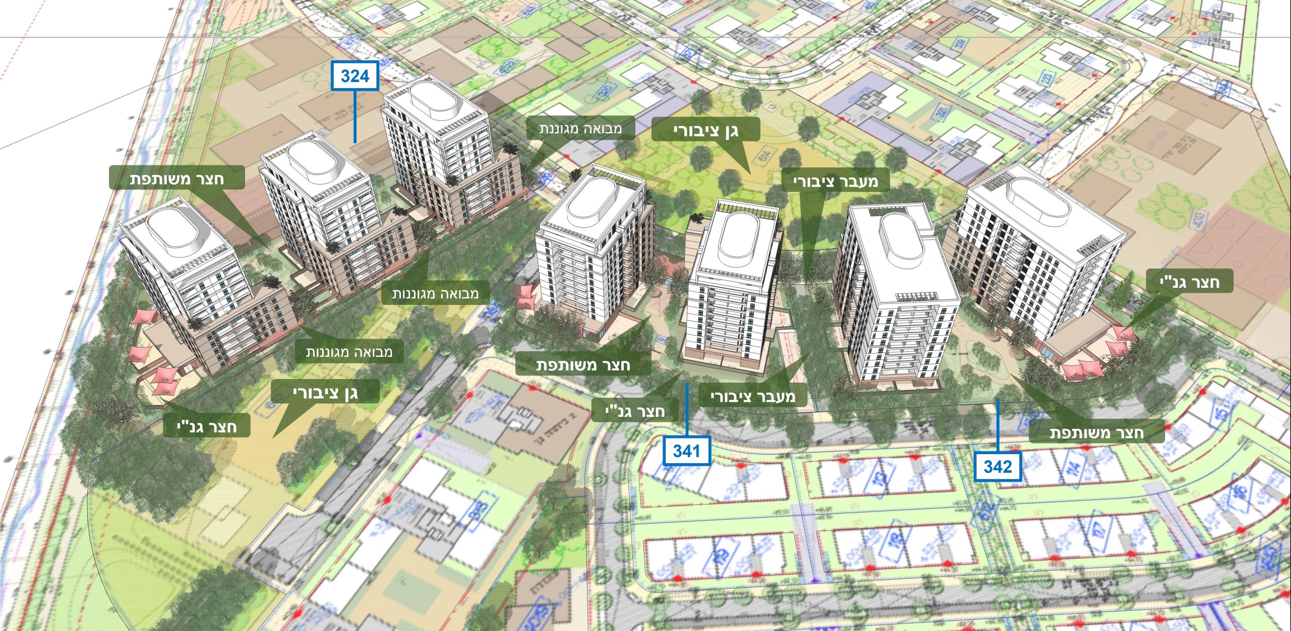 הסכימה התכנונית מיישמת עקרונות בינוי המייצרים התרחשות קהילתית, תוך עידוד הליכתיות ומתן מענה לצרכי הקהילה. הבינוי מציע שימוש אופטימלי לקירבת המתחם לפארקים הציבוריים ולמערך השטחים הפתוחים המפותח: מגינות המשותפות לדיירי הפרוייקט, גינות חצי – פרטיות למבננים השונים, חצרות גני ילדים וחצרות פרטיות. הבינוי המדורג מאפשר יצירת מרפסות גג איכותיות ומגוון דירות גדול במיוחד.